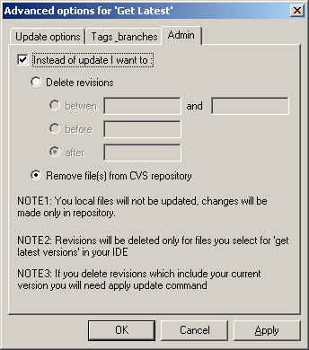 - Admin - The option "Instead of update I want to" allows deleting the specified revisions or excluding files from source control. Be careful when you delete revisions. The only purpose of this operation is decreasing the repository size due to losing the history of intermediate modifications. When you take a file out of control, CVS does not delete this file from the disk, but only marks it in the repository as deleted. This operation duplicates the command "Remove from source control", which is unreasonably absent in VS .NET.