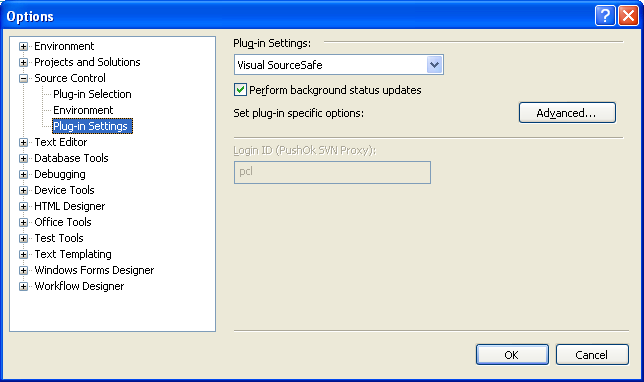 The Login ID (PushOK SVN Proxy) input field under Tools/Options/Source