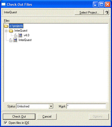 The first file is the "Check Out Files" dialogue in my IDE as it appears just after restarting the IDE. Note that none of the files in my project are listed.