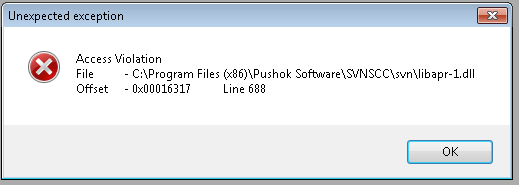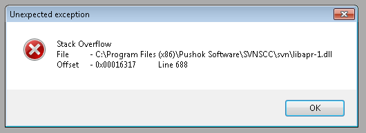 I checked in an AutomationDesk Project and when I try to check out and open it I receive the following error messages: Access Violation libapr-1.dll Line 688, (please refere attached screenshot) Stack Overflow libapr-1.dll Line 688, (please refere attached screenshot)