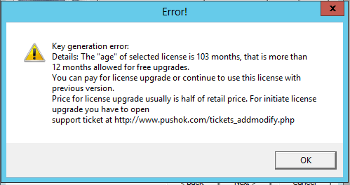Error Window Key generation error: Details: The "age" of selected license is 103 months, that is more than 12 months allowed for free upgrades.