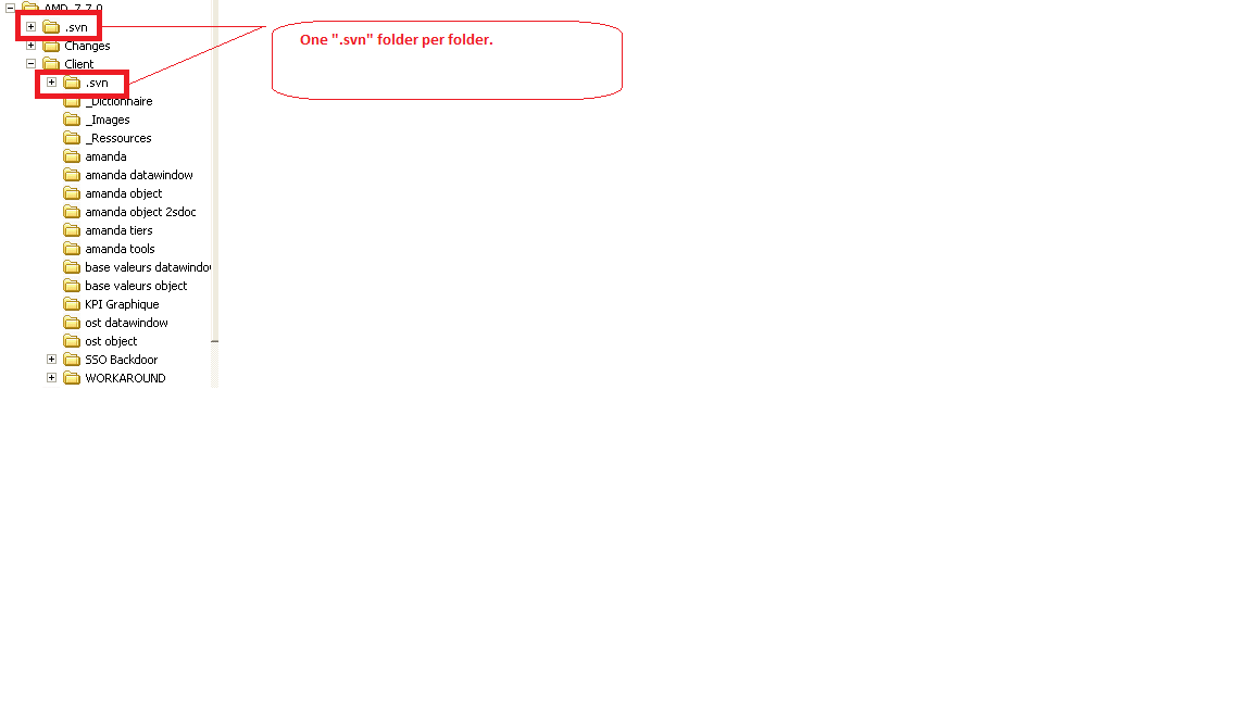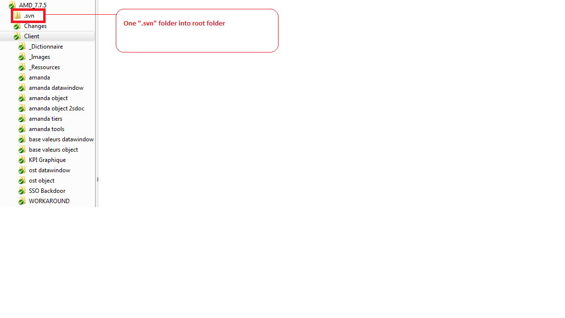 1) The version you gave me work fine but create ".svn" under "Client" sub-folder and it isn't good because we use the version 1.7.6 of tortoise and only one folder ".svn" is created (see before... and now attached files).