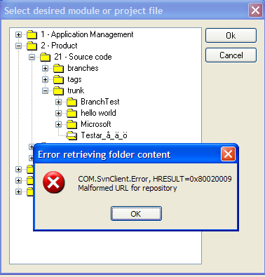 SVN-repository. If the SVN-module contains swedish characters the operation