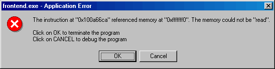 "The instruction at '0x100a1cca' referenced memory at '0xffffffff0'. The memory could not be read." |